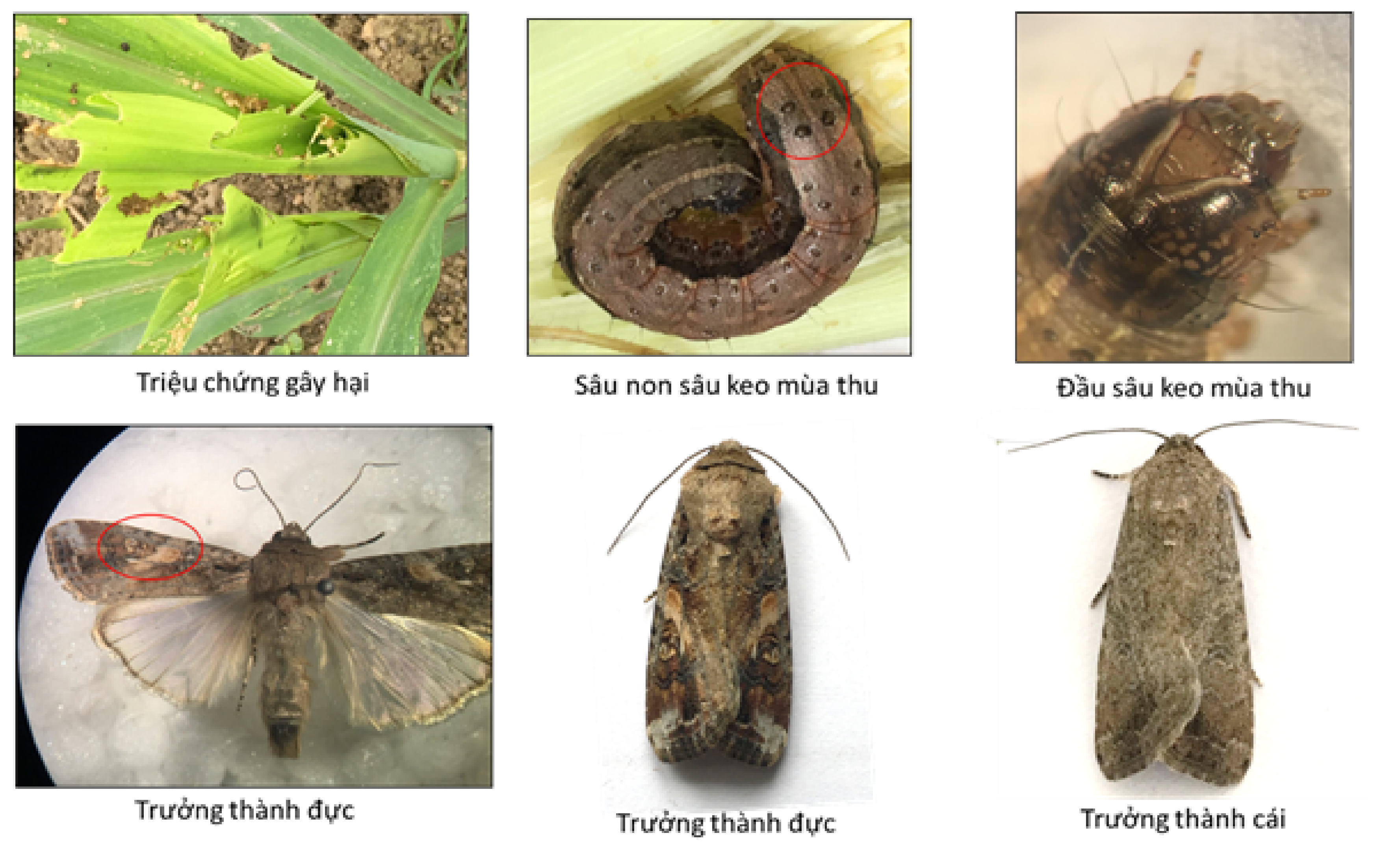 Sau đây là một số hình ảnh minh họa đặc điểm gây hại và một số đặc điểm hình thái giải phẫu bộ phận sinh dục nổi bật để nhận dạng sâu keo mùa thu.