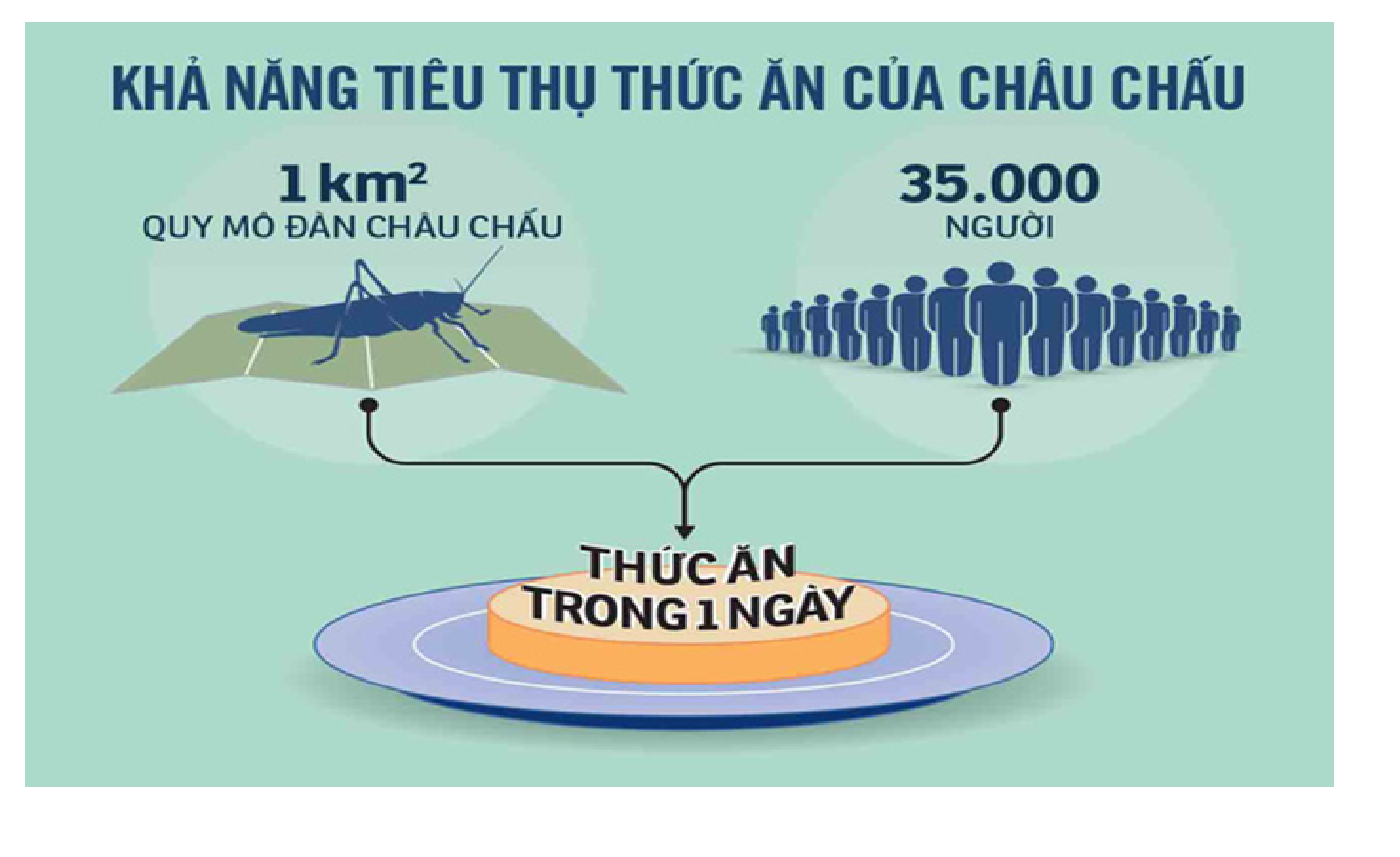 Theo ông Liêm, mỗi con châu chấu sa mạc trưởng thành tiêu thụ bình quân 200mg chất xanh/ngày. Trong khi đó, mật độ phân bố một đàn có thể lên tới 150 triệu con/km2, ước tính một đàn 1km2 có thể tiêu thụ lượng thức ăn 1 ngày tương đương lượng thức ăn của 35.000 người.