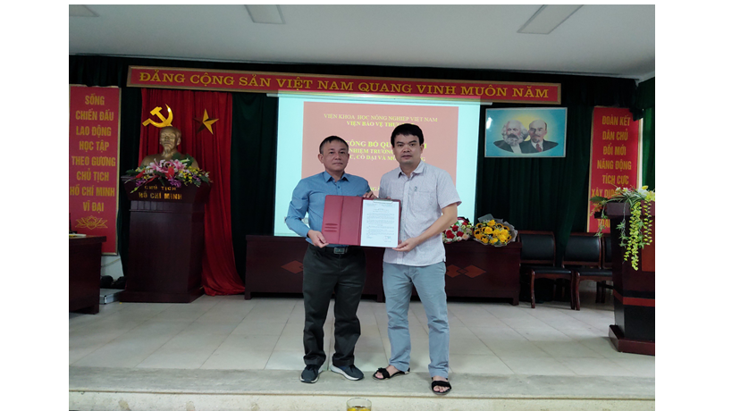 TS. Nguyễn Văn Liêm - Viện trưởng Viện Bảo vệ thực vật trao Quyết định bổ nhiệm Trưởng Bộ môn Thuốc, cỏ dại và môi trường cho TS. Đào Bách Khoa