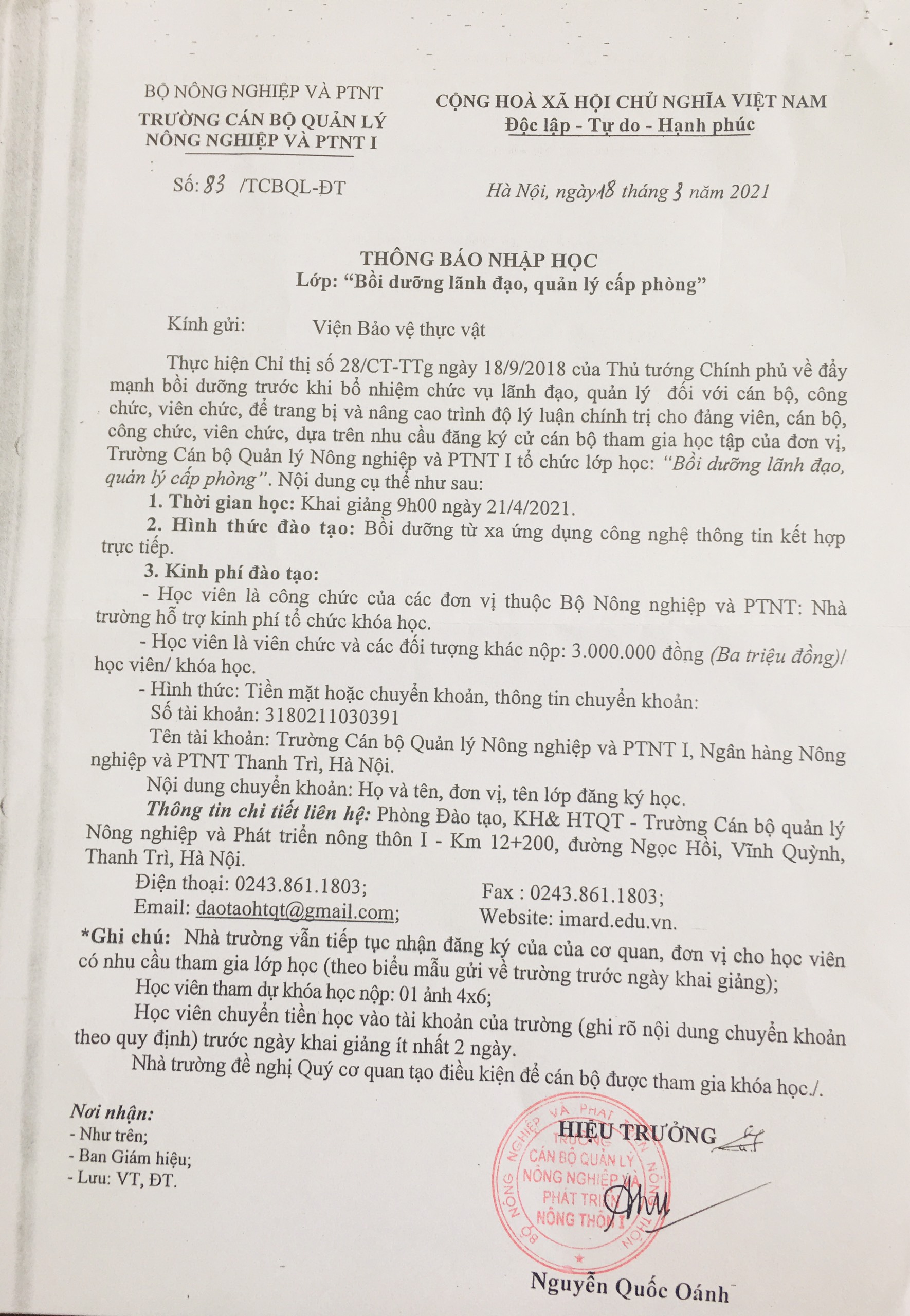 Trường Cán bộ Quản lý Nông nghiệp và PTNT I thông báo nhập học lớp: “Bồi dưỡng lãnh đạo, quản lý cấp phòng” như sau:
