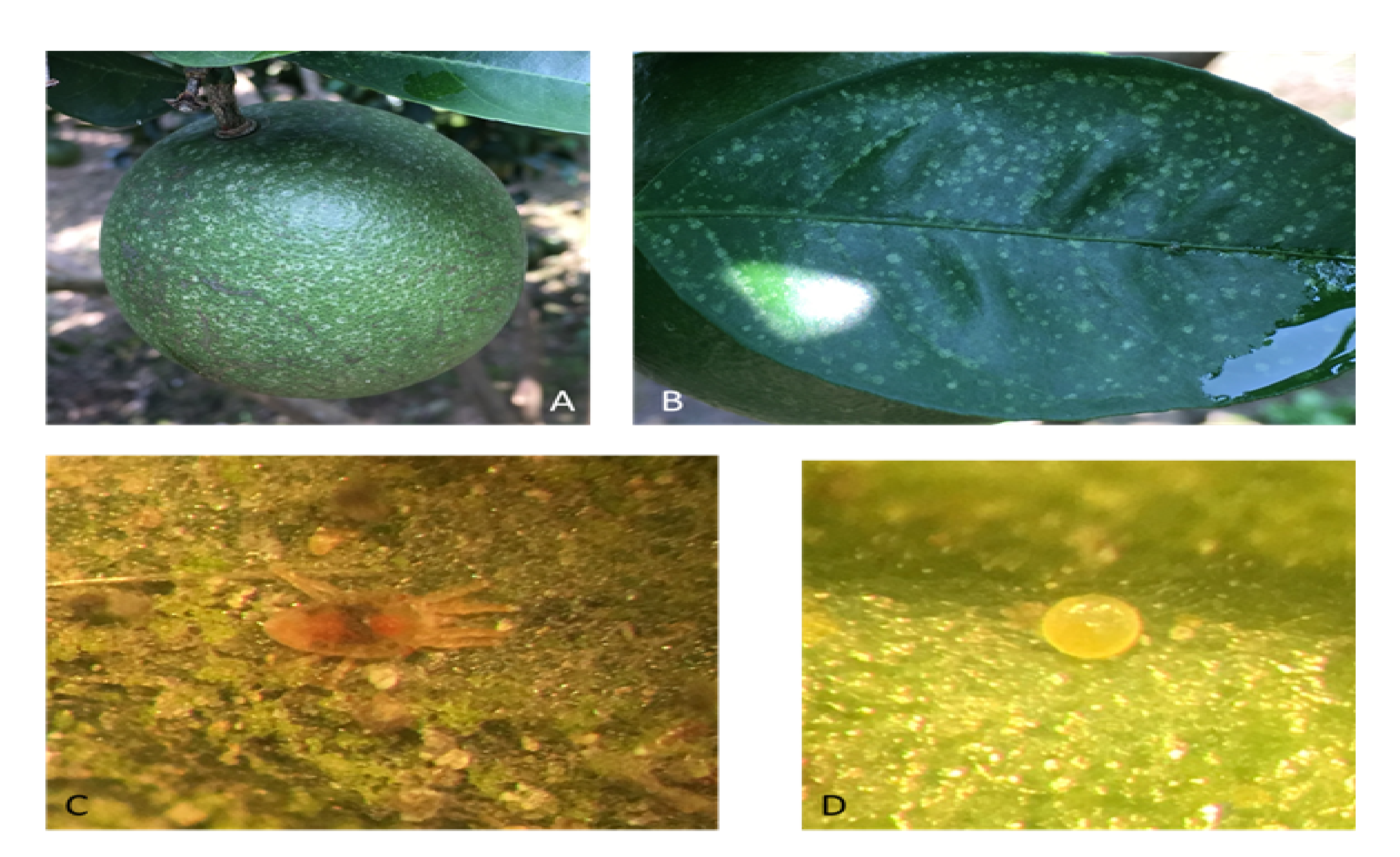 Hình 1: (A) triệu chứng gây hại trên quả; (B) triệu chứng gây hại trên lá; (C) nhệnSchizotetranychus sp.; (D) trứng nhện Schizotetranychus sp..