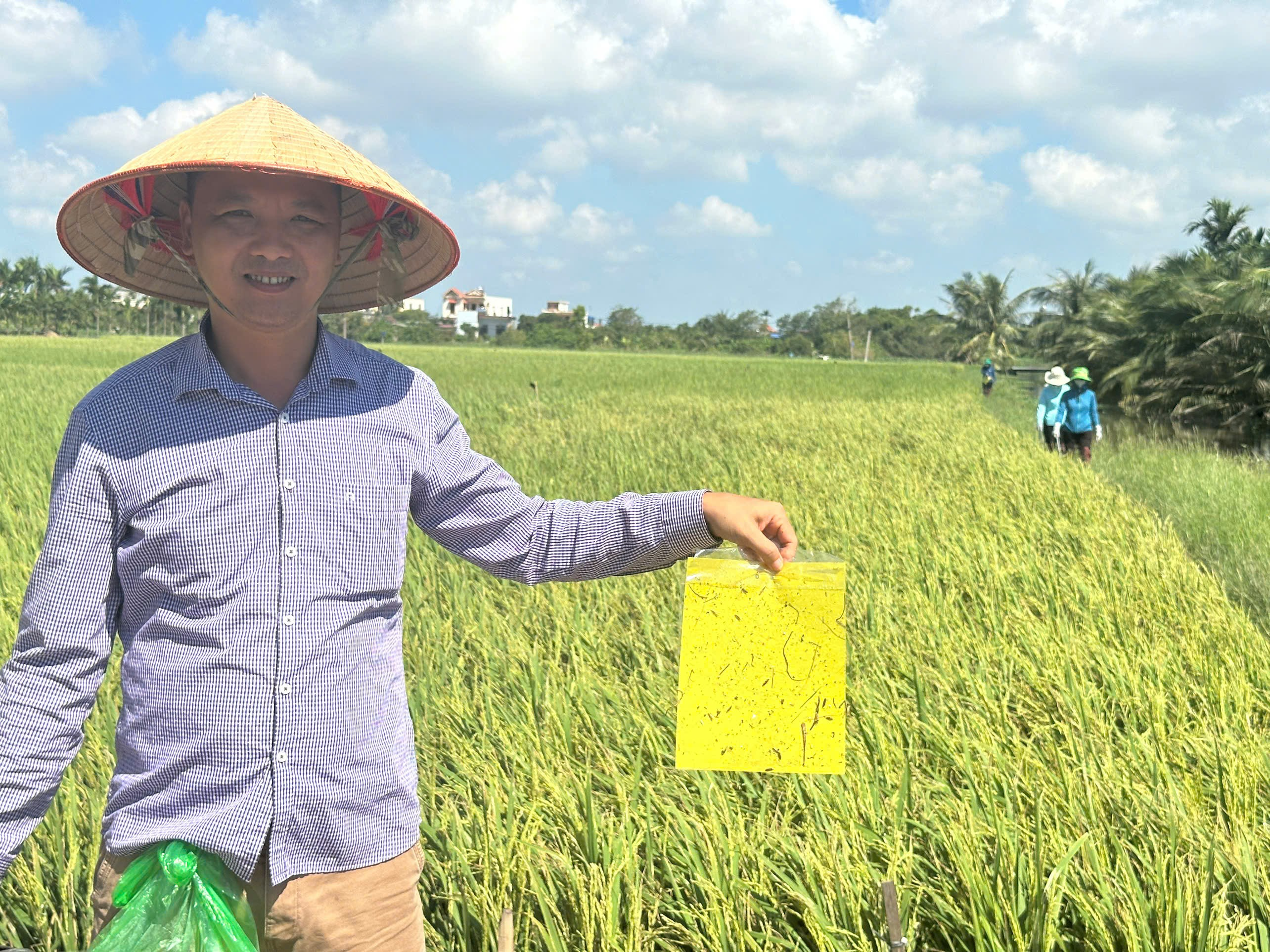 “Ruộng mô hình ít sâu bệnh, cây khỏe hơn, công phun thuốc giảm, năng suất vẫn ổn định và đỡ tốn kém hơn nhiều,” – ông Mai Văn Bản, nông dân tham gia mô hình chia sẻ.