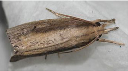 - Trưởng thành: màu nâu nhạt, sải cánh trưởng thành đực là 24,58 mm, trưởng thành cái là 28,84 mm. Trên cánh có những chấm nhỏ, không có gân ngang.