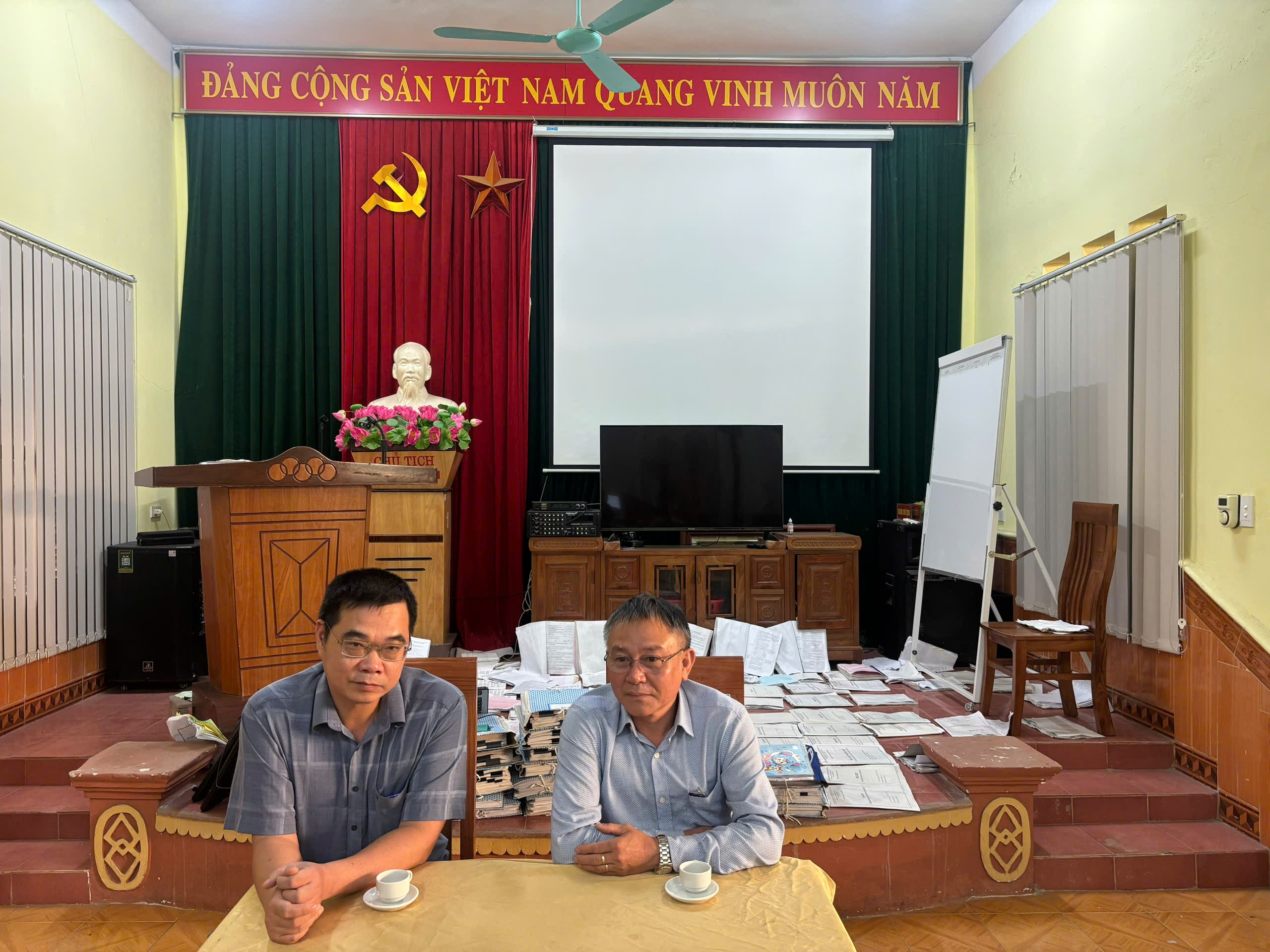 (Phía sau là tài liệu bị ngập lụt do cơn bão Matmo, đã làm tài liệu, hồ sơ bị ướt)