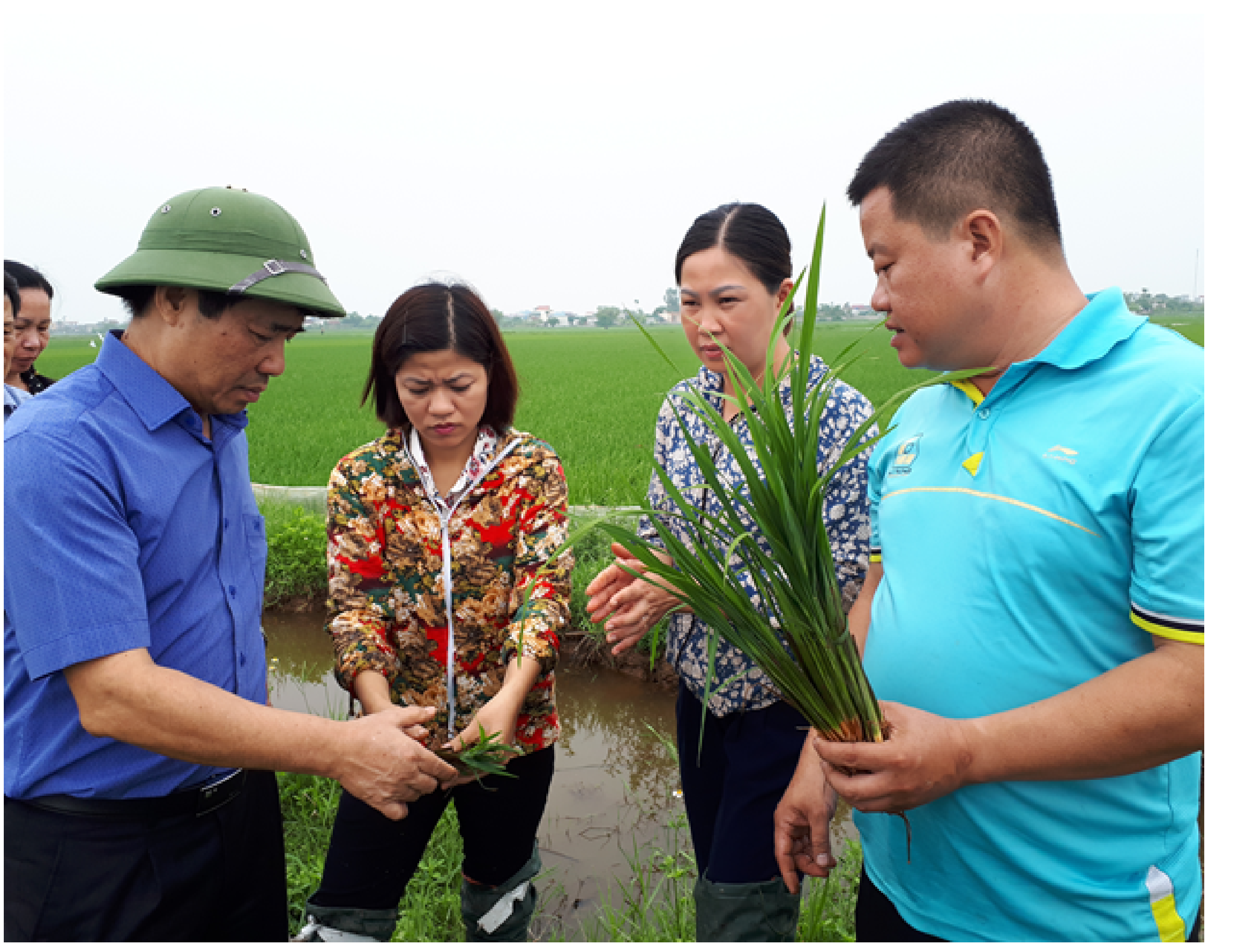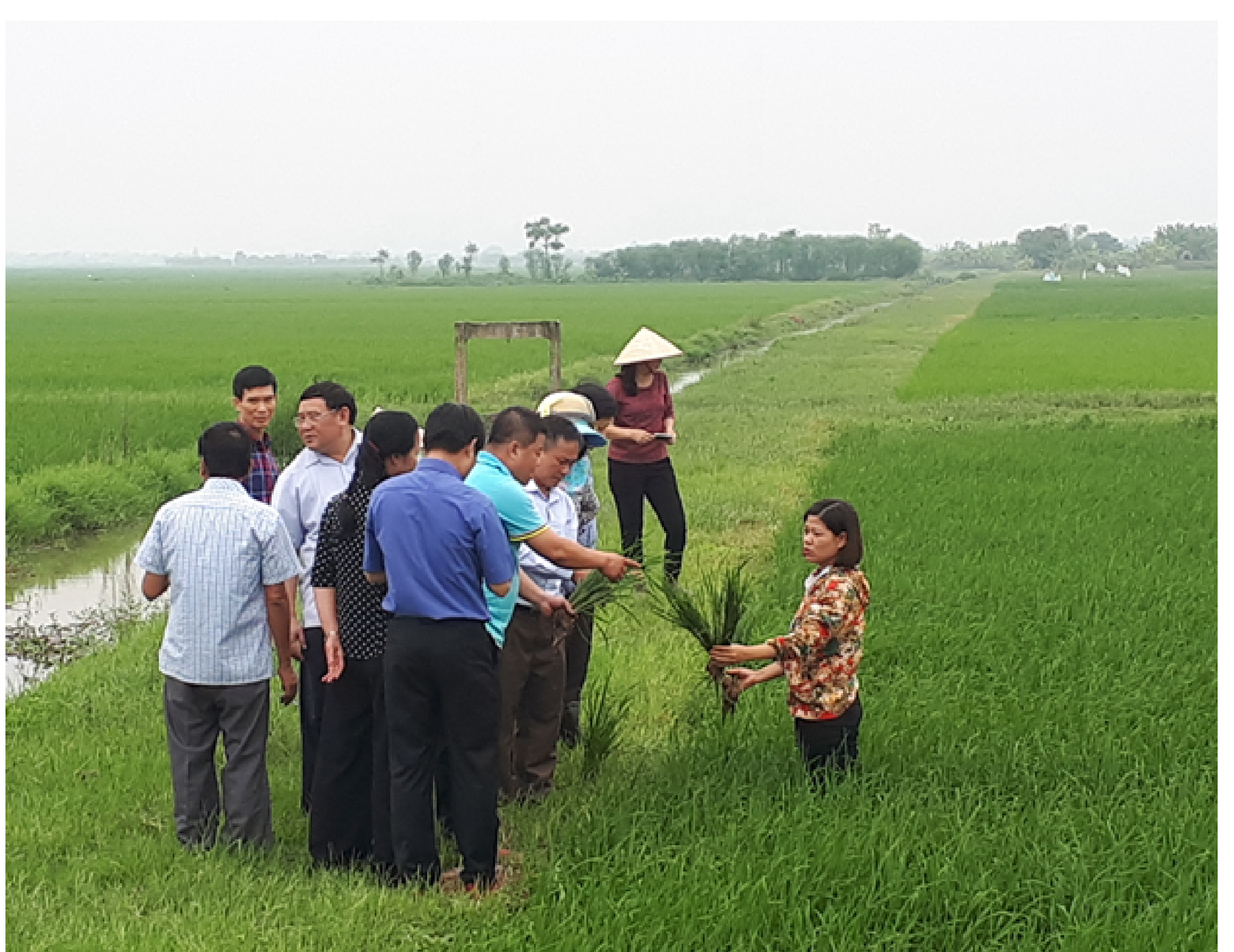 Cán bộ Viện BVTV trao đổi với lãnh đạo tỉnh và cán bộ kỹ thuật địa phương về nhận dạng triệu chứng bệnh lùn sọc đen phương Nam trên đồng ruộng