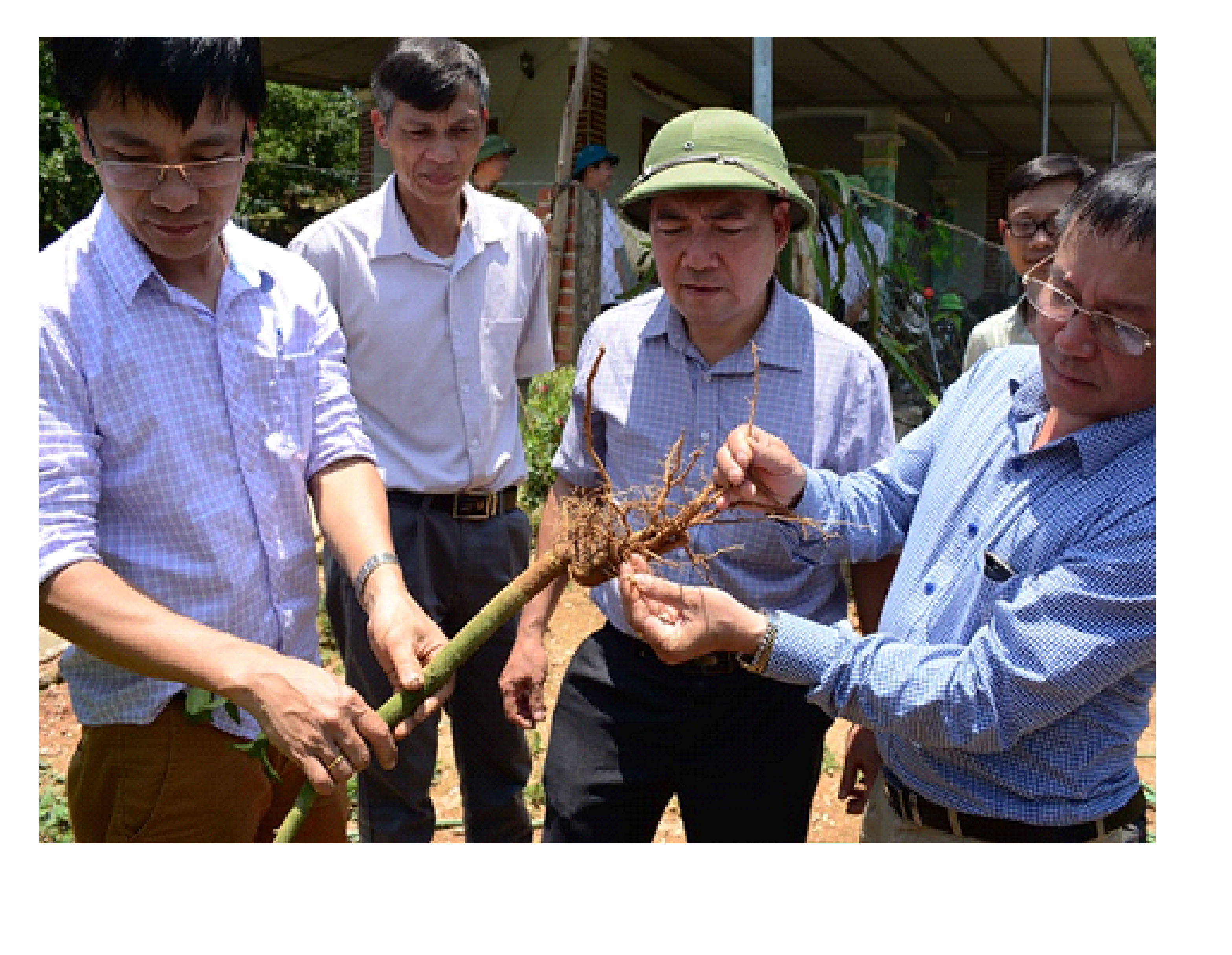 Đoàn công tác đã lấy mẫu lá, rễ của những cây bị bệnh và những cây chưa bị bệnh và tìm hiểu kỹ thuật canh tác của người dân.
